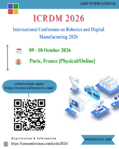 09oct(oct 9)9:00 am10(oct 10)5:00 pmInternational Conference on Robotics and Digital Manufacturing 2026ICRDM 20269:00 am - 5:00 pm (10)(GMT+02:00) Event Organized ByCORE Conferences